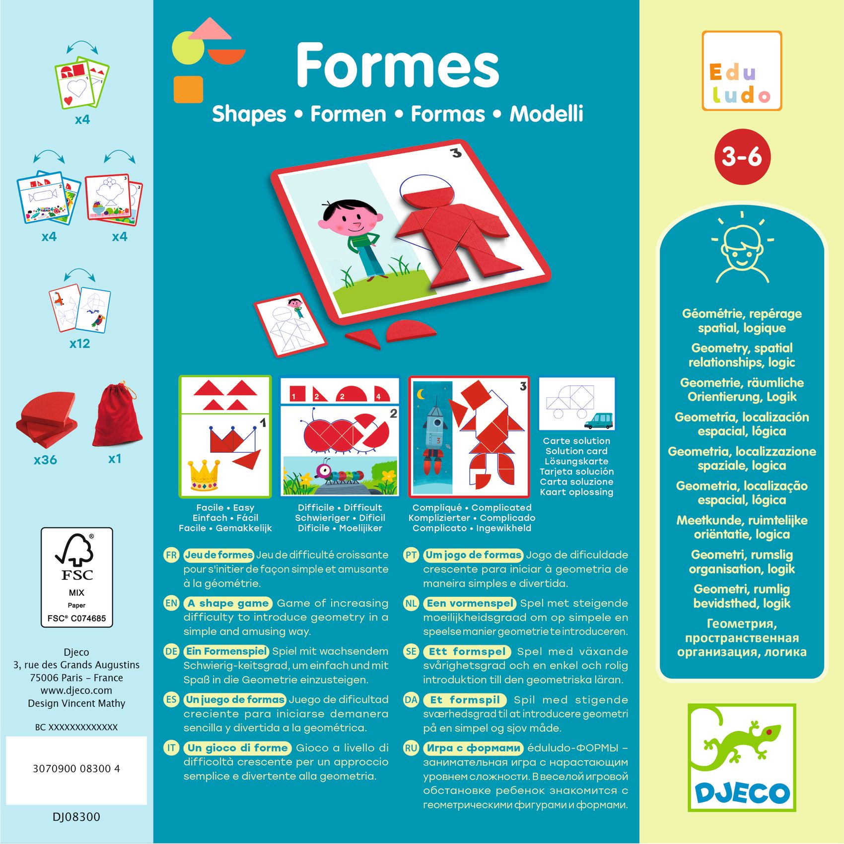 24 Aufgaben in 3 Schwierigkeitsstufen (12 beidseitig bedruckte Karten), 36 Holzteile in verschiedenen Formen und Größen, 1 Aufbewahrungstasche für die Holzteile, 12 beidseitig bedruckte Lösungskarten. Spielregeln in 10 Sprachen.