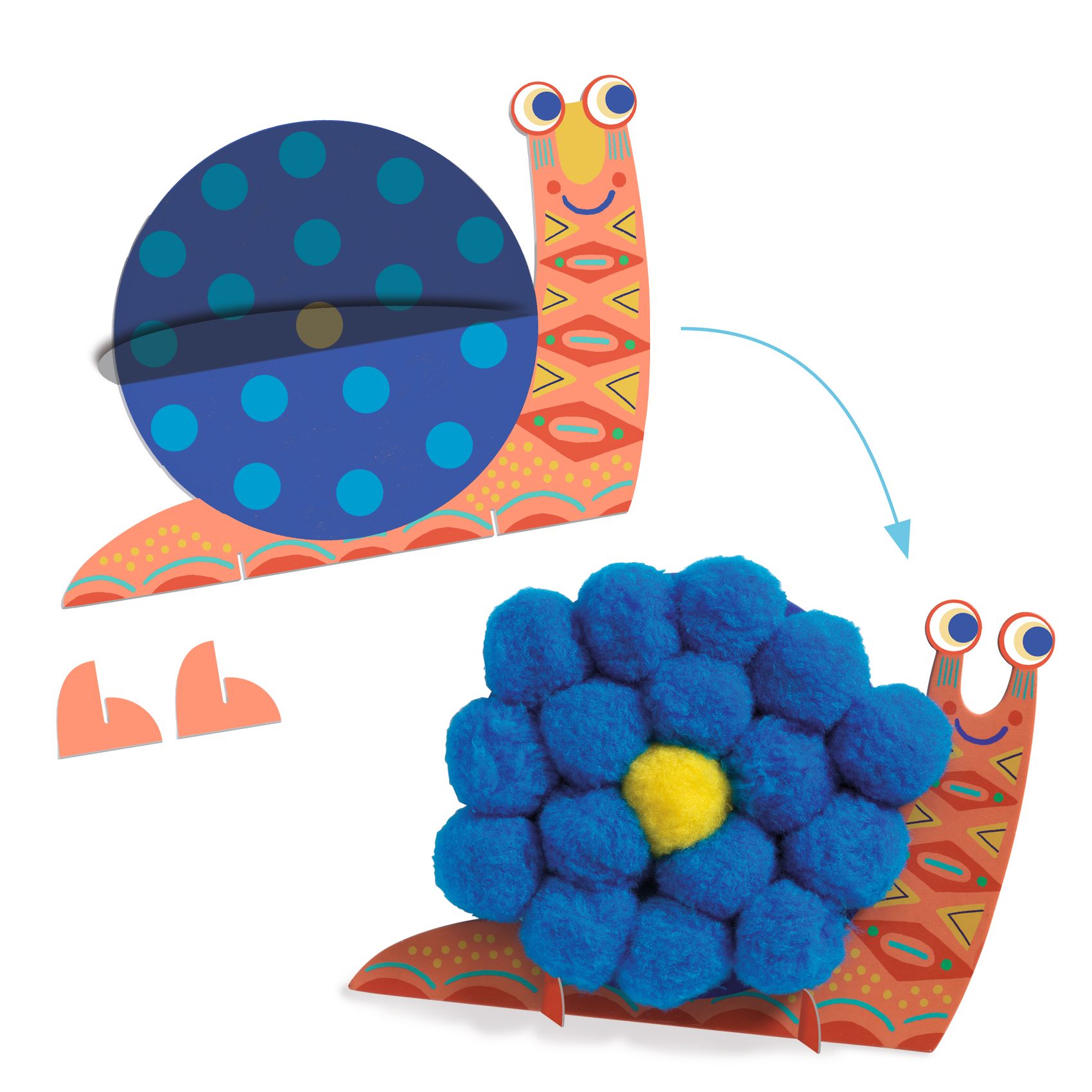 Ein Collageset zur Vervollständigung der 3 Tiere mit großen Pompons. Mit Hilfe der Vorlagen in der Schritt-für-Schritt-Anleitung klebt das Kind die bunten Pompons auf die selbstklebenden Bereiche der 3 Tiere. Überraschung! Das Ergebnis sind 3 flauschige Tiere zum Streicheln.